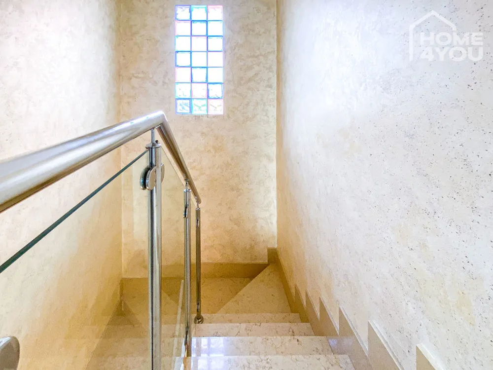 Das hochwertige Treppenhaus mit Marmorbelägen und Edelstahlgeländer beeindruckt.