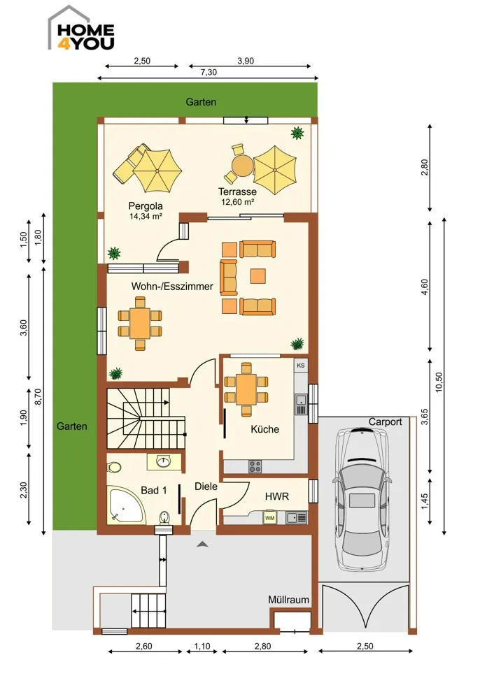 Im EG befindet sich der Lebensbereich mit Küche, einem Bad und dem großzügigen Wohn-/ Essbereich, von dem Sie direkt die Terrasse und den Außenbereich betreten können.