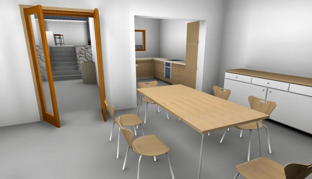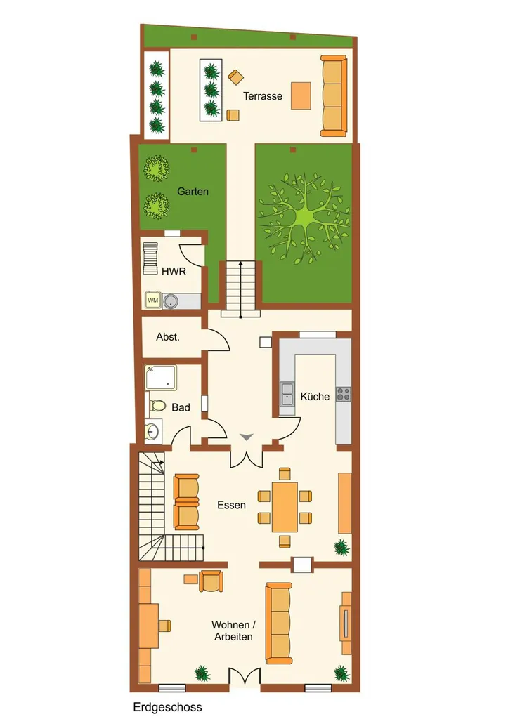 Das EG umfasst einen geräumigen Wohn-/ Essbereich mit großer Flügeltüre zum Garten, eine große Wohnküche mit Zugang zur Terrasse, Innenhof & Garten, ein Duschbad, WC und Bibliothek.